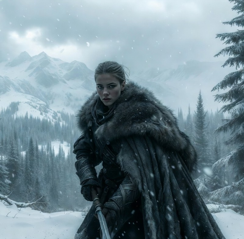 A dark, melancholic scene depicting a female warrior, music orchestrated and composed for a fantasy scheme. The instruments: strings, brass and archaic synthesizers, creating a war-like, stark blend.